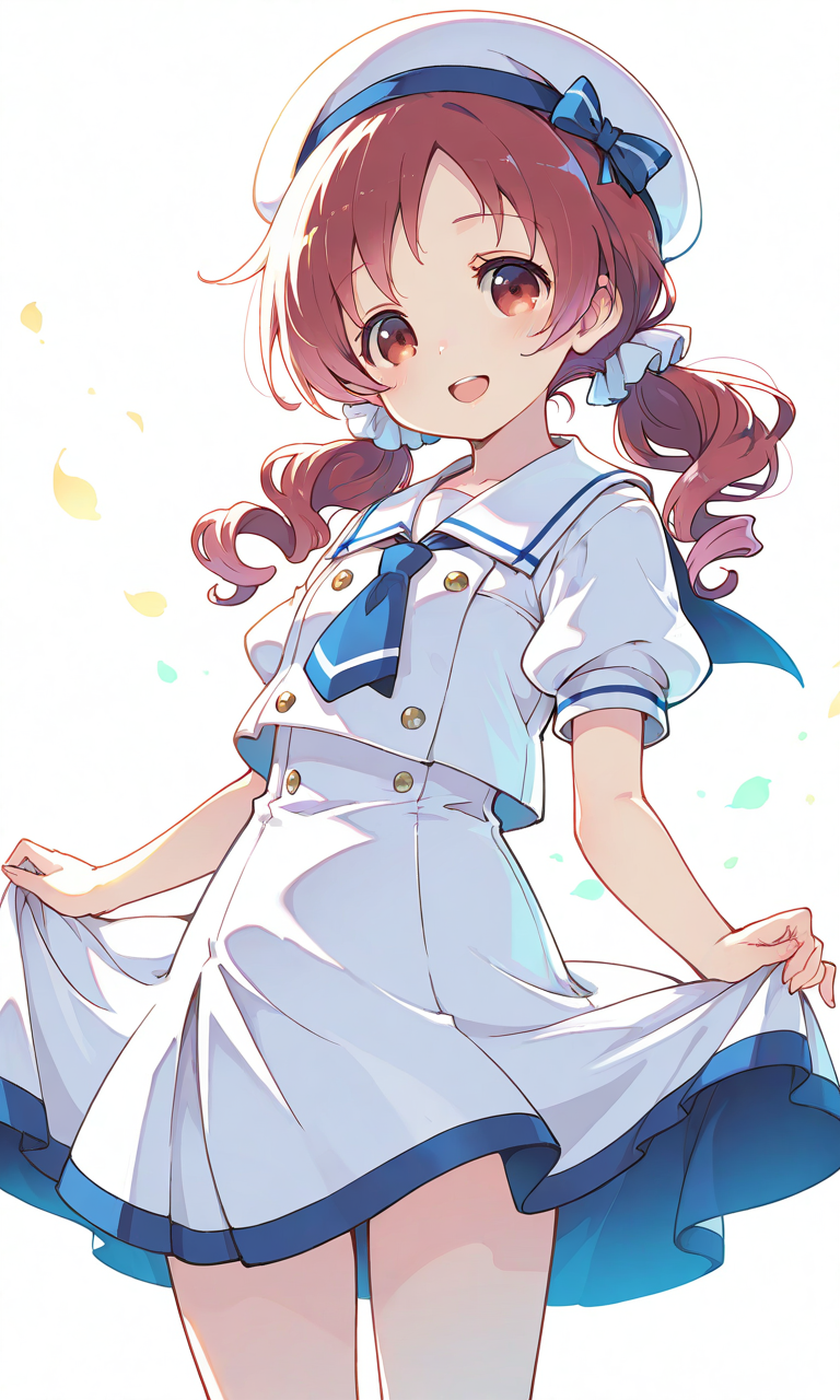 PixAI【Shiitake-Mix】natsu megumi, loli, solo, low twintails, ((kafuu chino’s school uniform)), smile, open mouth, cowboy shot, simple background, white background, masterpiece, high quality, high resolution, tokiame, cinematic lighting, cinematic angle, soft light, color detail, backlighting, depth of field, long exposure, light steps, intricate colors, vibrant colors