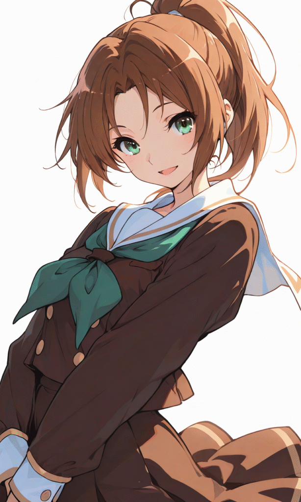 PixAI【Shiitake-Mix】nakagawa natsuki, 1girl, green eyes, kitauji high school uniform, long sleeves, brown serafuku, smile, open mouth, looking at viewer, green neckerchief, cowboy shot, simple background, white background, masterpiece, high quality, high resolution, tokiame, high-res, hyper-detailed, high contrast, depth of field, ray tracing, best lighting, cinematic composition, beautiful face, beautiful eyes, sharp focus, (masterpiece:1.2), (best quality:1.2), (very aesthetic:1.2), (absurdres:1.2), (detailed background)