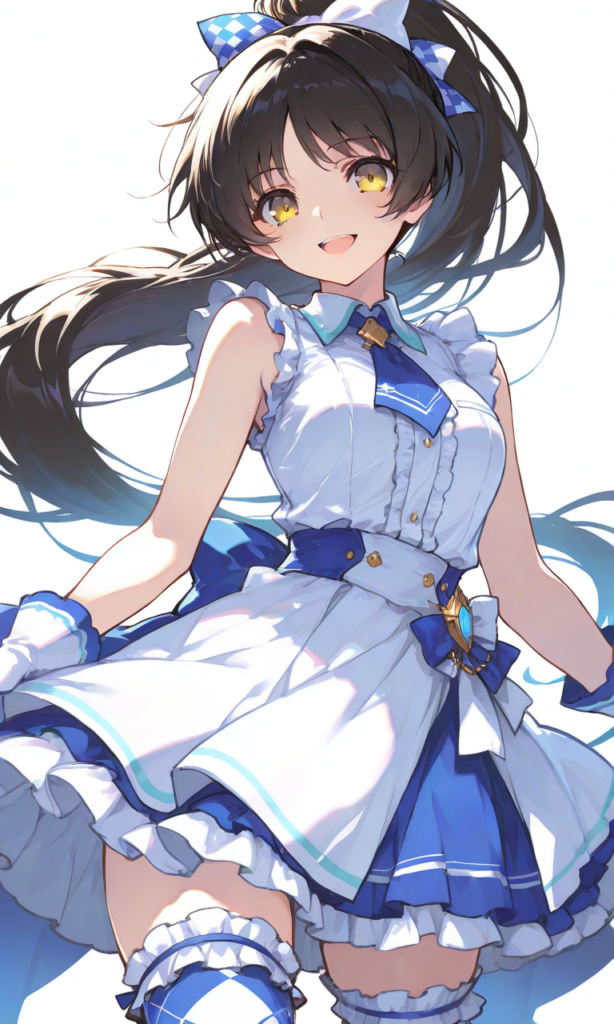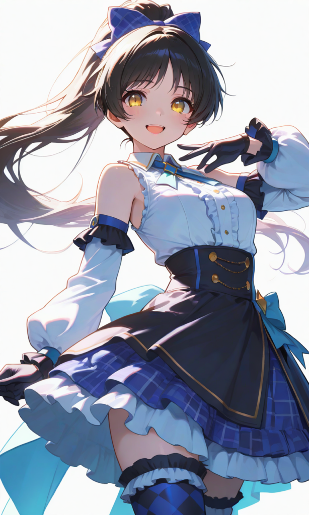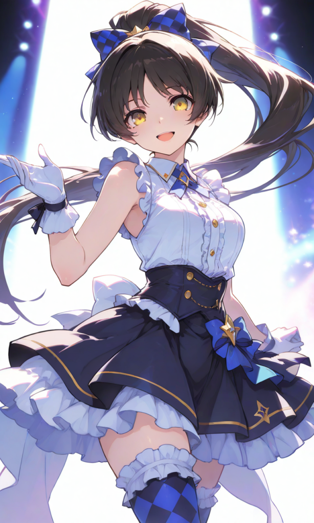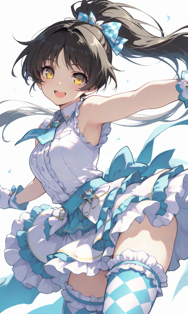 PixAI【Shiitake-Mix】hazuki ren,ponytail,yellow eyes, looking at viewer, idol clothes,light purple and white clothes:1.5,frilled medium skirt,neckerchie,checkered frilled thighhighs,tight dress shirt,sleeveless,gloves,smile,open mouth, cowboy shot,simplebackground,white background, masterpiece,high quality, high resolution,high-res,hyper-detailed, high contrast, depth of field, ray tracing, best lighting, cinematic composition, beautiful face, beautiful eyes, sharp focus, (masterpiece:1.2), (best quality:1.2), (very aesthetic:1.2), (absurdres:1.2), (detailed background),tokiame