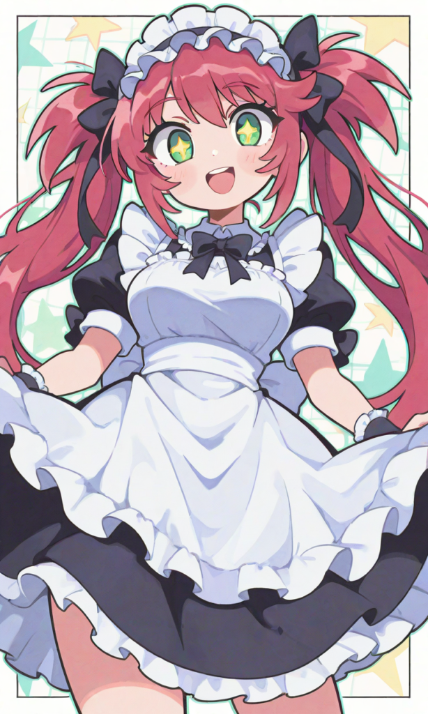 airi (queen’s blade), maid, short sleeves, hair ribbon, green eyes, smile, open mouth, cowboy shot, simple background, white background, masterpiece, high quality, high resolution, high-res, white border, ultra detailed, extremely hyper pastel coloring, style, minimal linework, glowing eyes, halftones, white star pupils, pop art, hard cell shading, extreme foreshortening, cartoony, toonish, moe style, (circle head: 1.2), (oval eyes: 1.4), vibrant background, neon pop art style