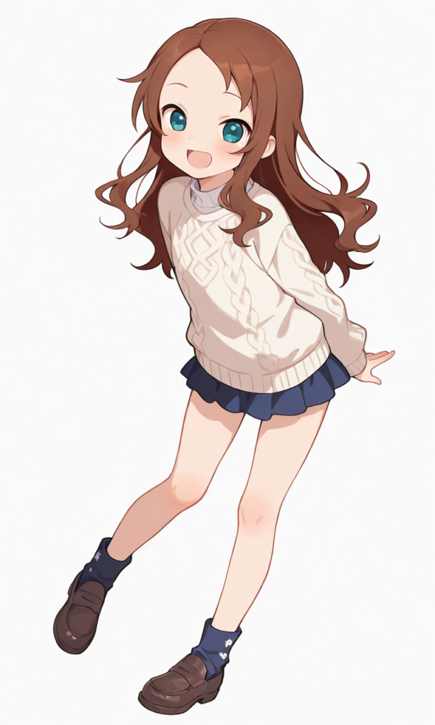 saikawa riko, 1girl, loli, solo, forehead, smile, open mouth, full body, sweater, miniskirt, simple background, white background, masterpiece, high quality, high resolution, high-res
