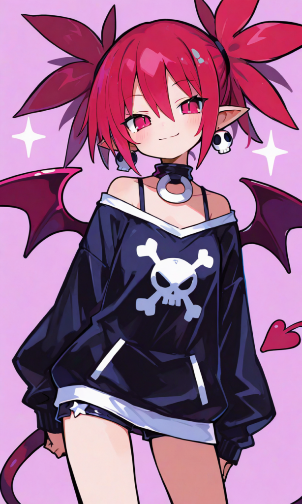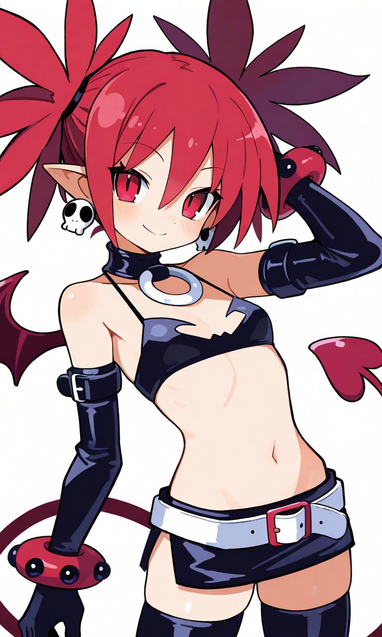 PixAI【Shiitake-Mix】etna (disgaea),smile,harada takehito (style), cowboy shot,simplebackground,white background,,masterpiece,high resolution,high quality,,high-res