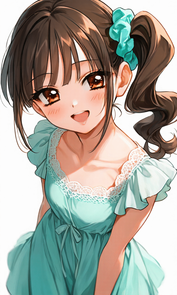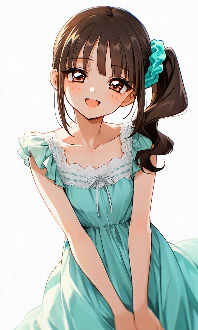 PixAI【Tsubaki】nekoyashiki_mayu, a little girl with long brown hair tied in a side ponytail secured by a soft aqua scrunchie, smiles brightly with her mouth slightly open, gazing directly at the viewer with warm brown eyes full of innocent joy. She wears a frilled dress with delicate lace details, rendered in hyper-detailed anime style reminiscent of the 1990s. Her posture is captured in a cowboy shot against a clean white background, with soft cinematic lighting enhancing the depth of field and subtle ray-traced reflections on her dress. Every strand of hair, fold of fabric, and texture of the scrunchie is meticulously rendered—no hair ornament present, only the simple, natural scrunchie. Her collarbone and delicate features are perfectly anatomized, radiating moe charm with flawless precision, high contrast, and absurd resolution detail.