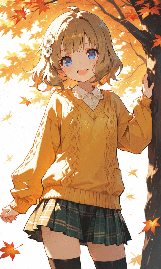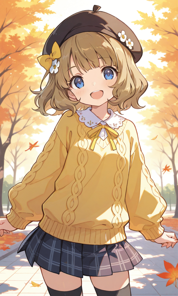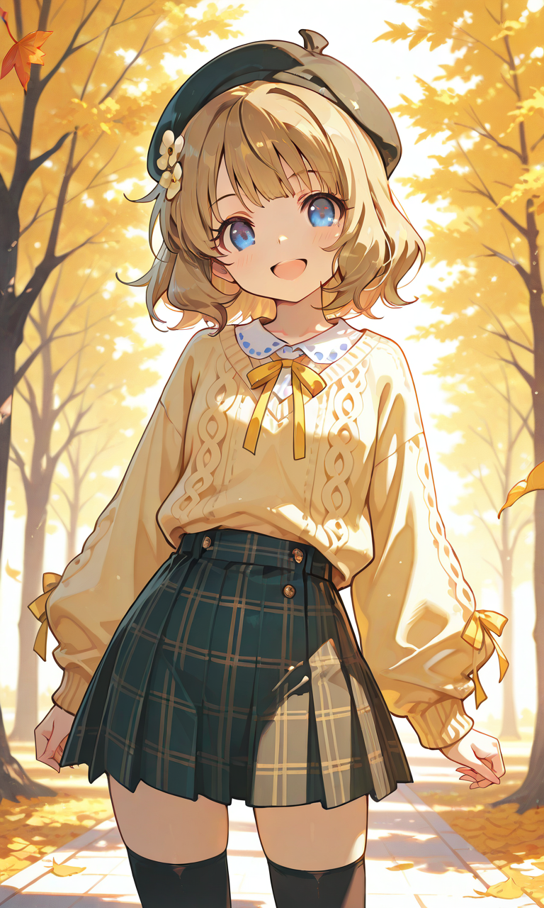 PixAI【Shiitake-Mix】suou momoko, 1girl, cheerful, elementary school age, yellow autumn fashion, fluffy yellow knit sweater, yellow-and-white plaid pleated skirt, black thighhighs, yellow ribbon beret, park, fallen leaves, warm sunset lighting, maple trees, smiling, kawaii, girly kids fashion, highly detailed, 8k, soft bokeh, cinematic lighting, dominant yellow tones, smile, open mouth, cowboy shot, simple background, white background, masterpiece, high quality, high resolution, tokiame, hyper-detailed, high contrast, depth of field, ray tracing, best lighting, cinematic composition, beautiful face, beautiful eyes, sharp focus, (masterpiece:1.2), (best quality:1.2), (very aesthetic:1.2), (absurdres:1.2), (detailed background)