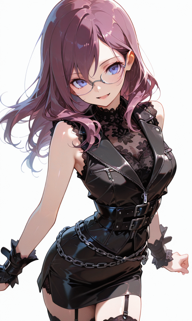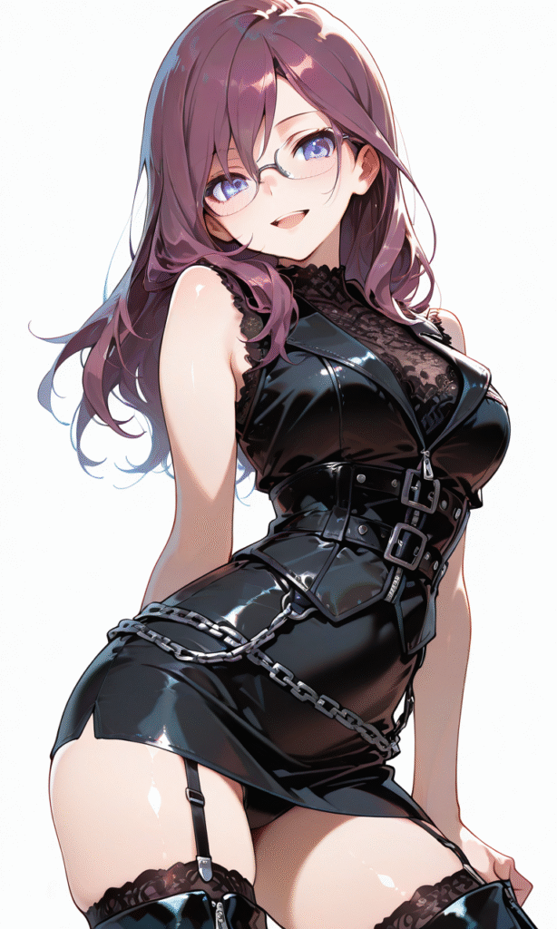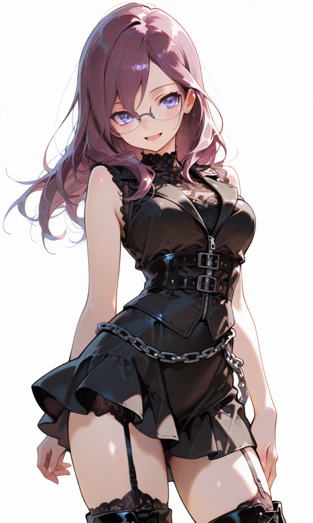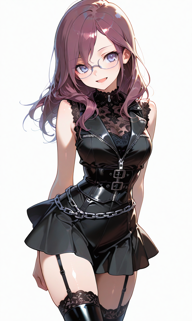 PixAI【Shiitake-Mix】yagami makino, glasses, black military long vest with a large zipper, lace sleeveless blouse, bikini, belt corset, zippered mini skirt with lots of lace, chain belt, garter belt, long boots with lots of belts, smile, open mouth, cowboy shot, simple background, white background, masterpiece, high quality, high resolution, tokiame, hyper-detailed, high contrast, depth of field, ray tracing, best lighting, cinematic composition, beautiful face, beautiful eyes, sharp focus, (masterpiece:1.2), (best quality:1.2), (very aesthetic:1.2), (absurdres:1.2), (detailed background), shiny skin, shiny