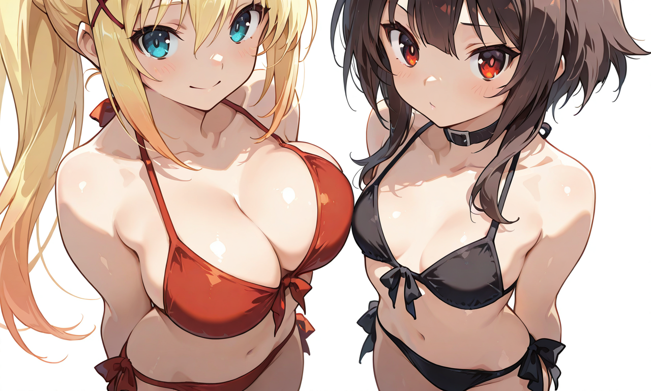PixAI【Shiitake-Mix】2girls, darkness(konosuba), megumin(konosuba), bikini, cowboy shot, breast focus, simple background, white background, masterpiece, high quality, hyper-detailed, high contrast, depth of field, ray tracing, best lighting, cinematic composition, beautiful face, beautiful eyes, sharp focus, (masterpiece:1.2), (best quality:1.2), (very aesthetic:1.2), (absurdres:1.2), (detailed background), tokiame (artist)