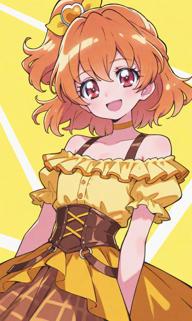 yamabuki inori(precure),yellow punk style blouse, (off shoulder, short puff sleeves), bare arms, corset with lace-up, leather harness straps, layered flared skirt with jagged hem, wide A-line silhouette,smile,open mouth, cowboy shot,simplebackground,masterpiece,high quality, high resolution,high-res,neon pop art style,cinematic lighting , cinematic angle, soft light , color detail, backlighting, Depth of field, long exposure, light steps, intricate colors, vibrant colors,