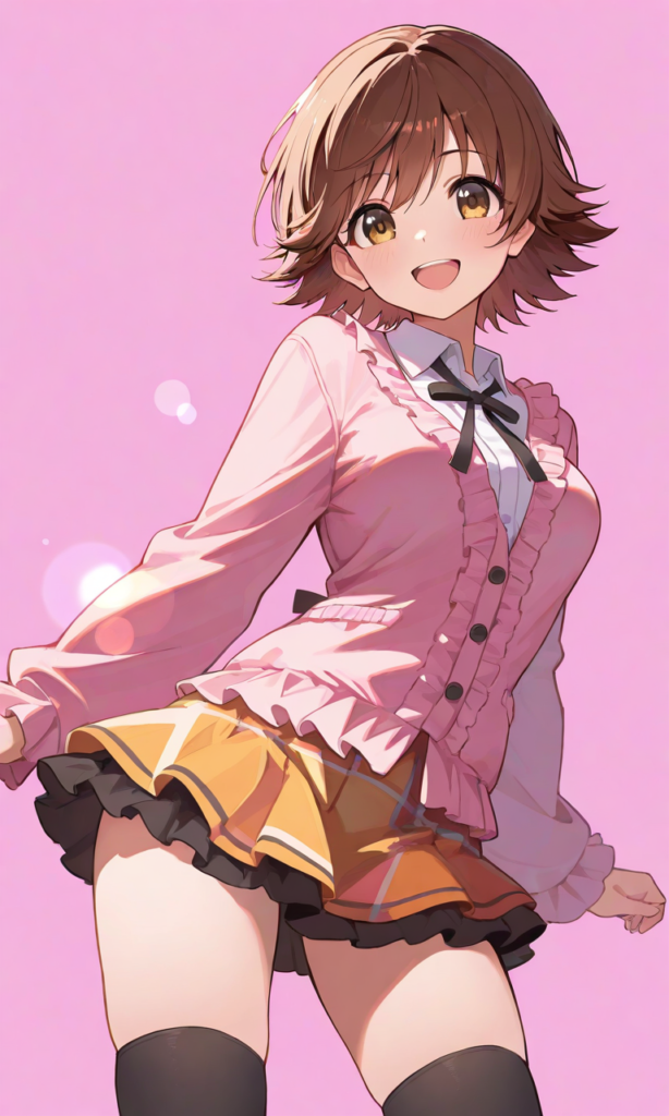 (pink mini skirt:1.3), double frill layers, black ribbon trim, soft flare silhouette,(black knee-high socks:1.2),open mouth, cowboy shot,simplebackground, masterpiece,high quality, high resolution ,high-res,neon pop art style