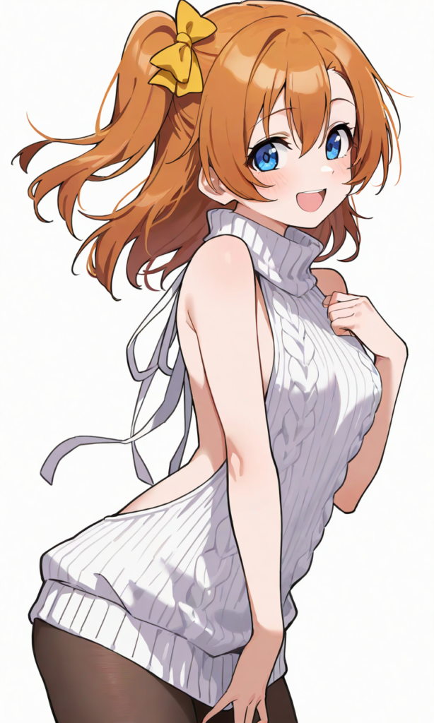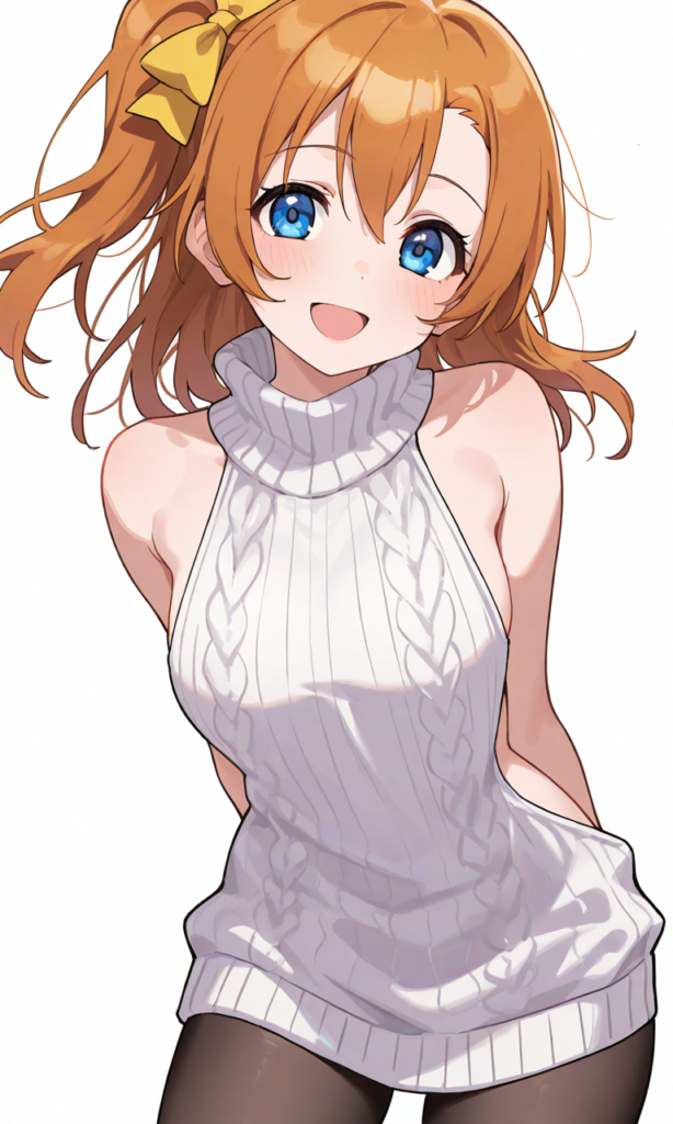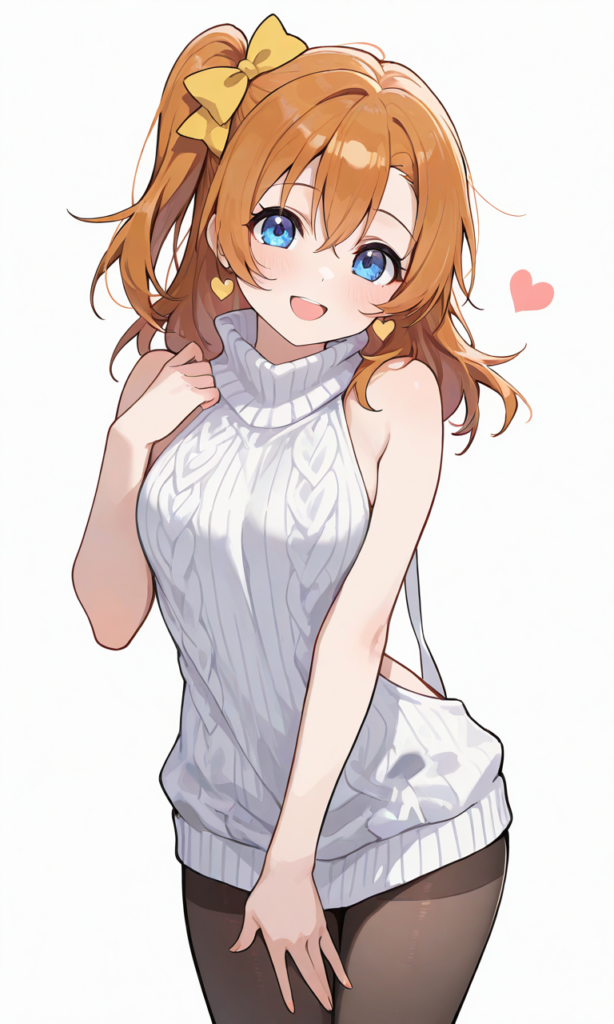 PixAI【Shiitake-Mix】kosaka honoka,smile,open mouth,yellow hairribbon,virgin killer sweater,white sweater, pantyhose,looking at viewer, cowboy shot,simplebackground,white background, masterpiece,high quality, high resolution ,high-res,♡masterpiece, highest quality, ♡,