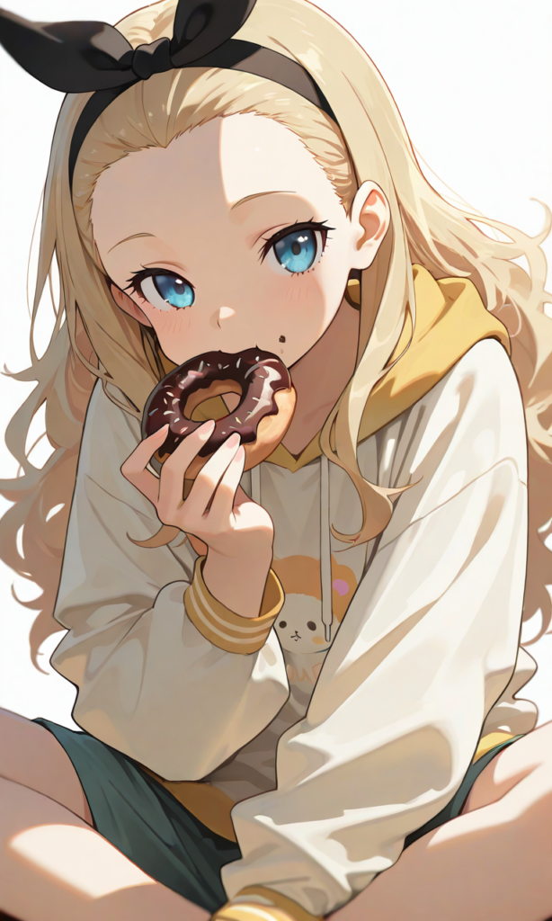 kurumi (lycoris recoil,hairribbon),indian style, eating, doughnut, cowboy shot,simplebackground,white background, masterpiece,high quality,high resolution ,high-res,hyper-detailed, high contrast, depth of field, ray tracing, best lighting, cinematic composition, beautiful face, beautiful eyes, sharp focus, (masterpiece:1.2), (best quality:1.2), (very aesthetic:1.2), (absurdres:1.2), (detailed background),
