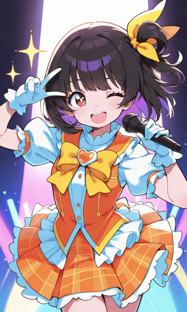 nakatani iku, yellow hairribbons,one eye winking, cheerful open-mouth smile, holding microphone, v, wearing vibrant yellow frilly top with puffy short sleeves, large yellow bow at chest, orange plaid mini skirt with ruffles, white gloves, dynamic pose as if performing on stage, sparkling effects, high detail, vibrant colors, anime style, high resolution,cowboy shot,simplebackground,masterpiece,high quality, high resolution,high-res,neon pop art style,cinematic lighting , cinematic angle, soft light , color detail, backlighting, Depth of field, long exposure, light steps, intricate colors, vibrant colors,