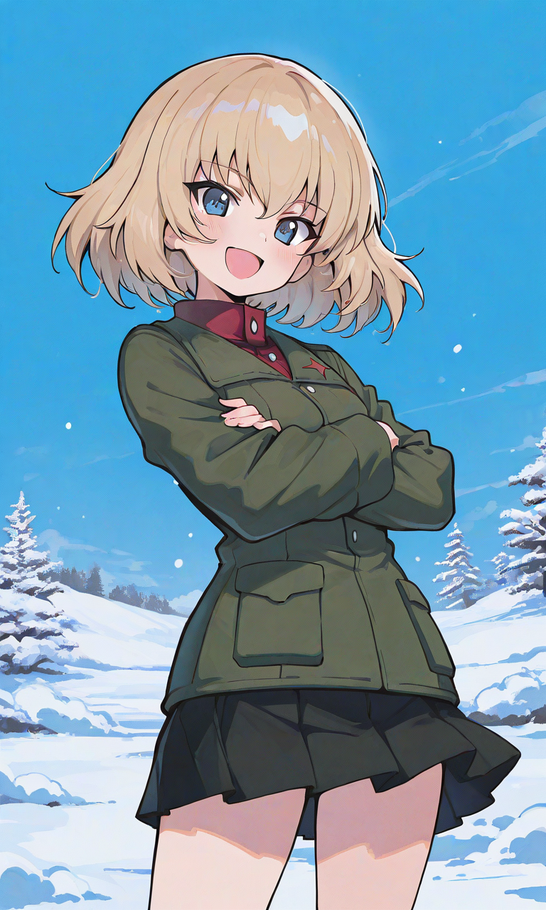PixAI【Shiitake-Mix】katyusha (girls und panzer),pravda military uniform,miniskirt,smile,open mouth,crossed arms, cowboy shot,simplebackground,snow,masterpiece,high quality, high resolution,high-res,neon pop art style,♡masterpiece, highest quality, ♡