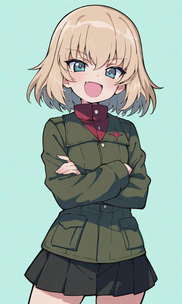 katyusha (girls und panzer),pravda military uniform,smile,open mouth,crossed arms, cowboy shot,simplebackground,masterpiece,high quality, high resolution,high-res,neon pop art style,Shining Style Art, masterpiece, best quality, very aesthetic, highres, absurdres,