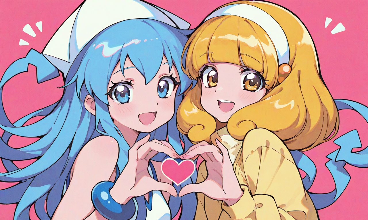 2girls,kise yayoi(precure), ikamusume,heart hands, smile,open mouth, upper body, simplebackground,masterpiece,high quality, high resolution,neon pop art style,high-res