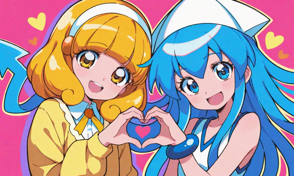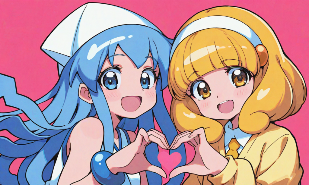PixAI【Shiitake-Mix】2girls,kise yayoi(precure), ikamusume,heart hands, smile,open mouth, upper body, simplebackground,masterpiece,high quality, high resolution,neon pop art style,high-res,♡masterpiece, highest quality, ♡
