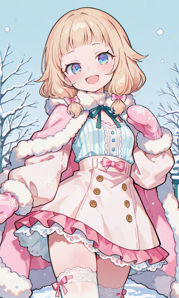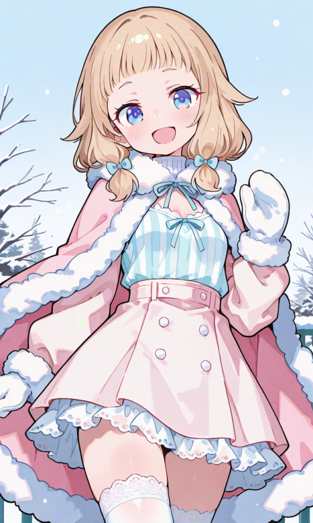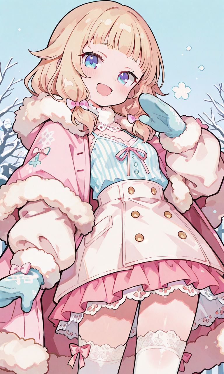 PixAI【Shiitake-Mix】NEW GAME,sakura nene,blue eyes,no hair ornament, pastel pink winter outfit, soft tweed short cape coat with fluffy white fur trim around the collar and hem, matching tweed one-piece dress with flared skirt and white fur hem, long white fitted turtleneck inner top, white thigh-high socks with frilled lace and ribbon bows, mittens gloves, soft cute winter look,smile,open mouth,striped camisole,miniskirt, cowboy shot,looking at viewer, simplebackground,park, winter, masterpiece,high quality, ,748cmstyle,neon pop art style,yume335 style, (masterpiece)