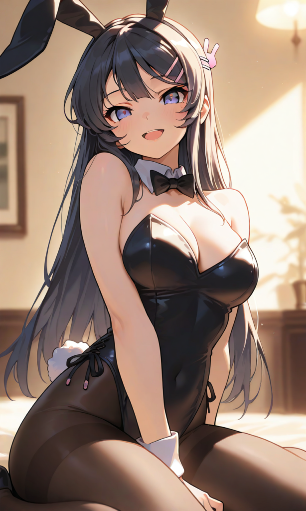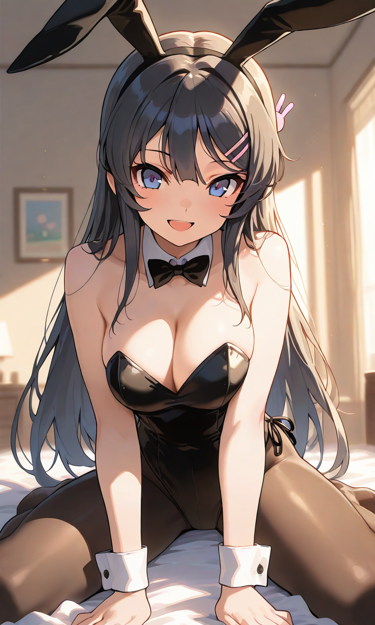 PixAI【Shiitake-Mix】sakurajima mai,bunnygirl,pantyhose, smile,open mouth, cowboy shot,wariza, room,simplebackground,masterpiece,high quality, high resolution,high-res,hyper-detailed, high contrast, depth of field, ray tracing, best lighting, cinematic composition, beautiful face, beautiful eyes, sharp focus, (masterpiece:1.2), (best quality:1.2), (very aesthetic:1.2), (absurdres:1.2), (detailed background),