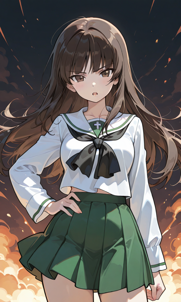 PixAI【Shiitake-Mix】((manga style)),nishizumi shiho(girls und panzer),ooarai school uniform,long sleeves,serious, open mouth, hand on own hip,explosion, cowboy shot,masterpiece,high quality, ,cinematic lighting , cinematic angle, soft light , color detail, backlighting, Depth of field, long exposure, light steps, intricate colors, vibrant colors,♡masterpiece, highest quality, ♡