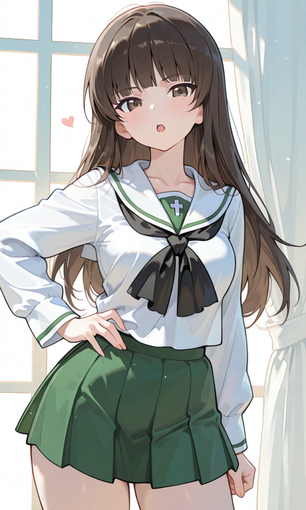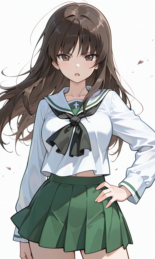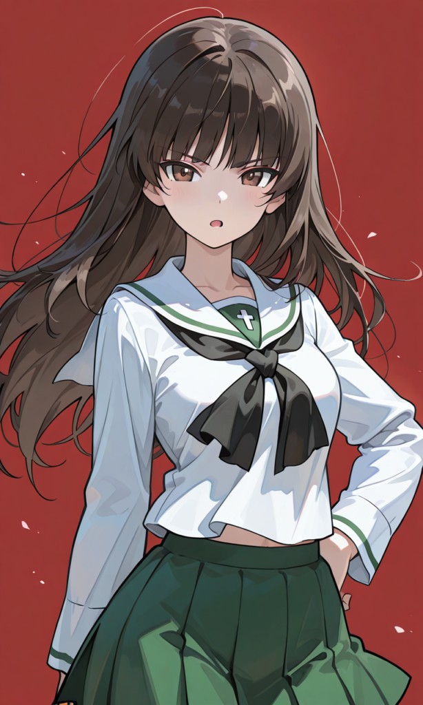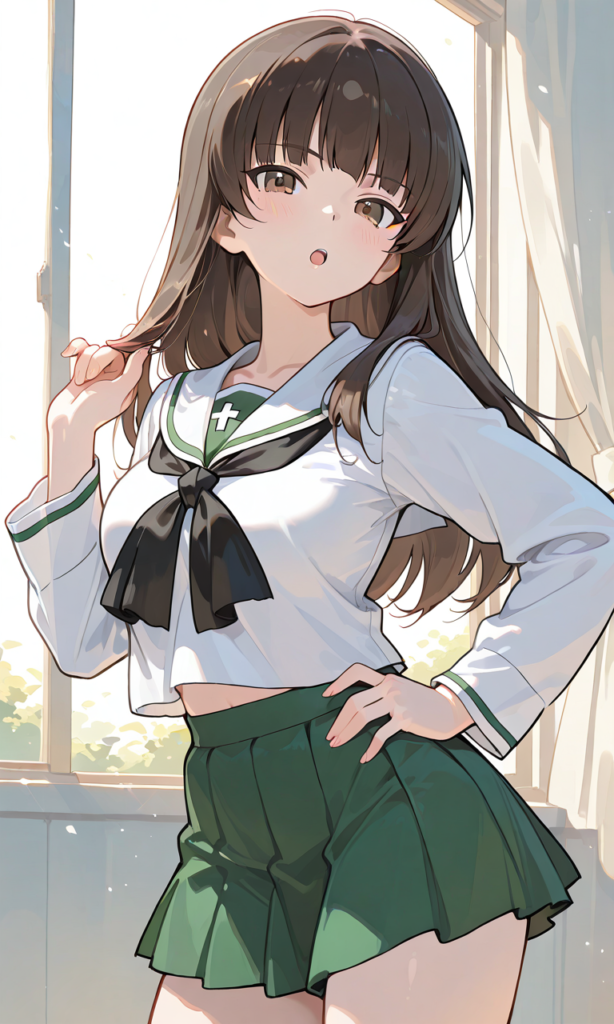 ((manga style)),nishizumi shiho(girls und panzer),ooarai school uniform,long sleeves,serious, open mouth, hand on own hip, cowboy shot,masterpiece,high quality, ,♡masterpiece, highest quality, ♡,
