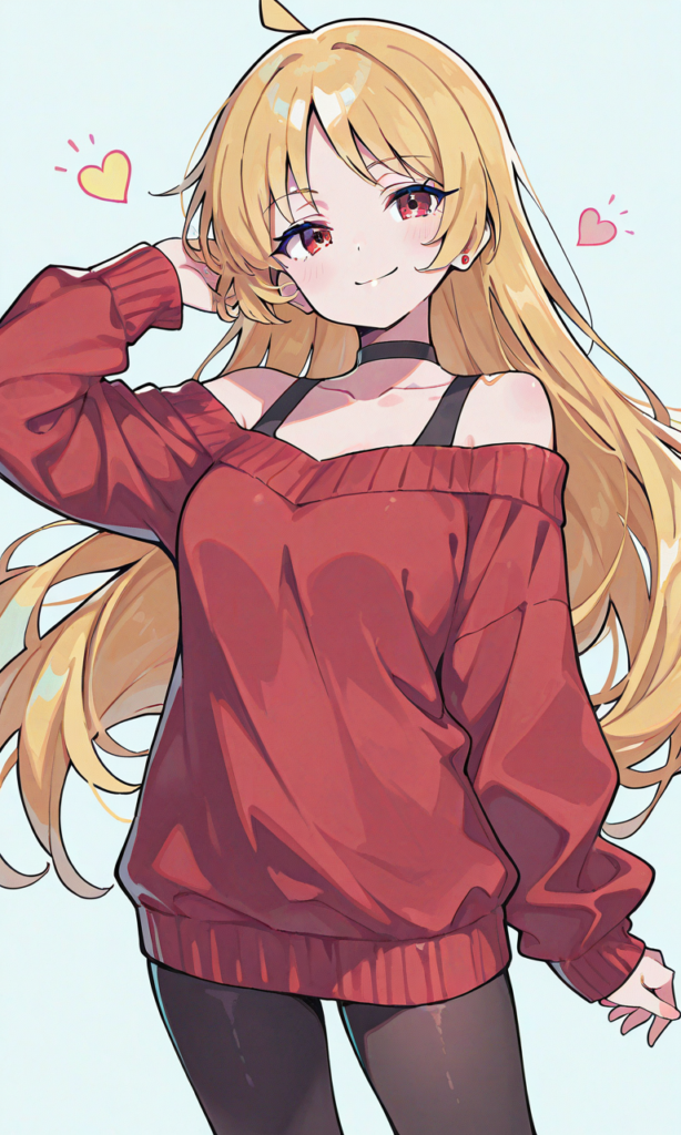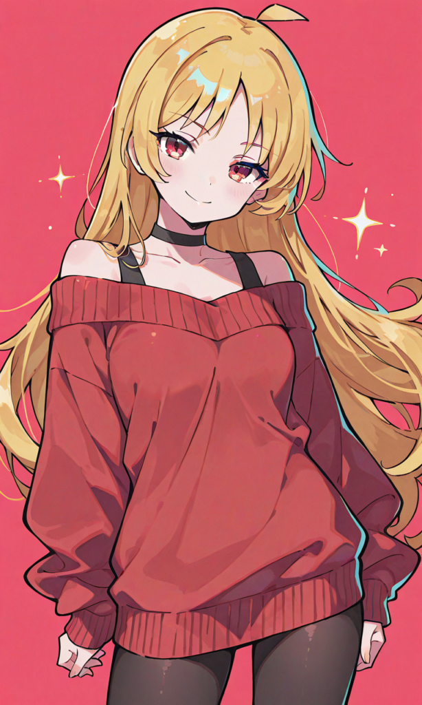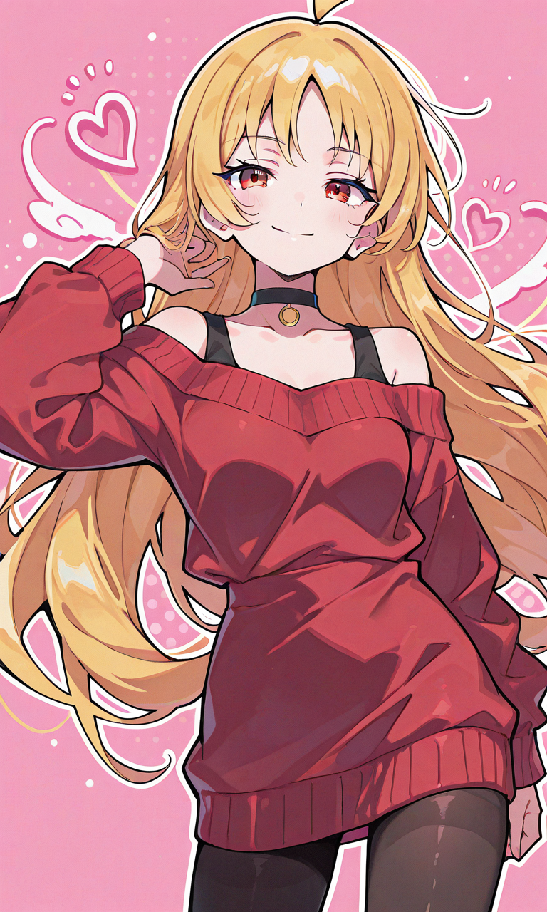 PixAI【Shiitake-Mix】ijichi seika, 1girl, choker, red sweater, long sweater, off-shoulder, pantyhose, smile, cowboy shot, masterpiece, high quality, neon pop art style, ♡masterpiece, highest quality, ♡
