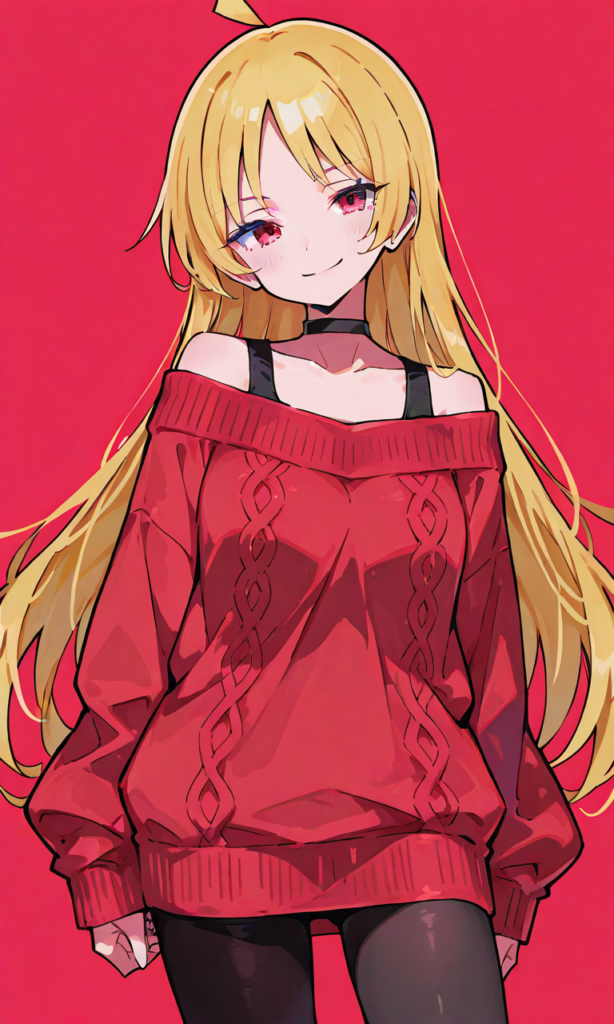 1girl, ijichi seika, choker, red sweater, long sweater, off-shoulder, pantyhose, smile, cowboy shot, simple background, masterpiece, high quality, neon pop art style, ♡masterpiece, highest quality, ♡