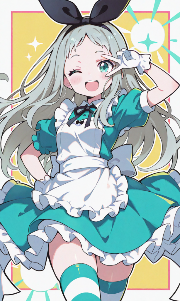 PixAI【Shiitake-Mix】kanzaki hideri, smile,open mouth,black hairribbon,one eye closed,pretty,v_over_eye,alice (alice in wonderland) (cosplay),green dress, green&white striped thighhighs, white gloves, cowboy shot,masterpiece,high quality, high resolution,neon pop art style