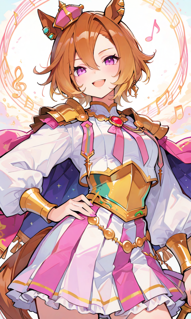 t.m. opera o (umamusume), smile,open mouth,hand_on_own_hip,looking at viewer, cowboy shot,musical note,masterpiece,high quality, high resolution,high-res,748cmstyle,♡masterpiece, highest quality, ♡