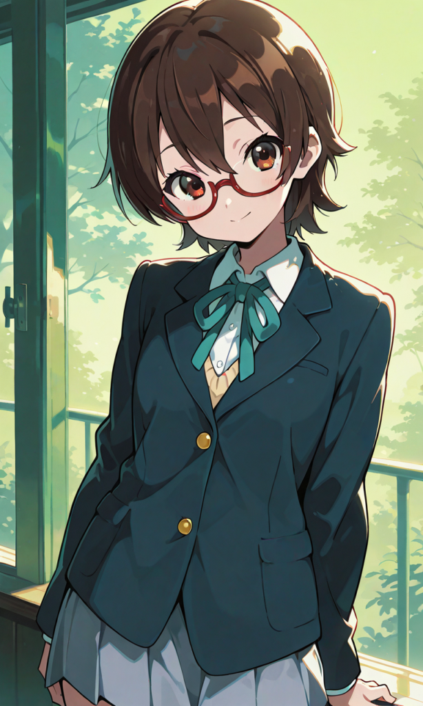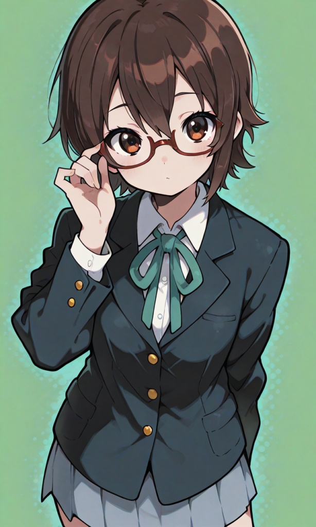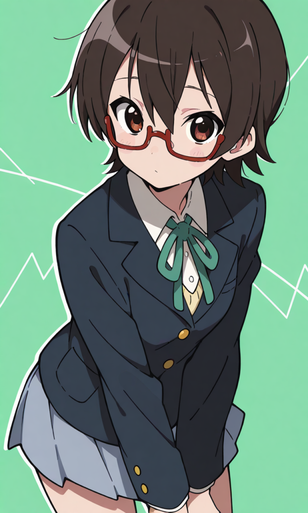 PixAI【Shiitake-Mix】(flat design, anime coloring, vivid:1.5), solo,manabe nodoka(k-on!),glasses,short hair, school uniform,blazer,((3button)),green neckribonn,cowboy shot,looking at viewer,masterpiece,high quality,high resolution,light green background,neon pop art style,hyper-detailed, high contrast, depth of field, ray tracing, best lighting, cinematic composition, beautiful face, beautiful eyes, sharp focus, (masterpiece:1.2), (best quality:1.2), (very aesthetic:1.2), (absurdres:1.2), (detailed background),
