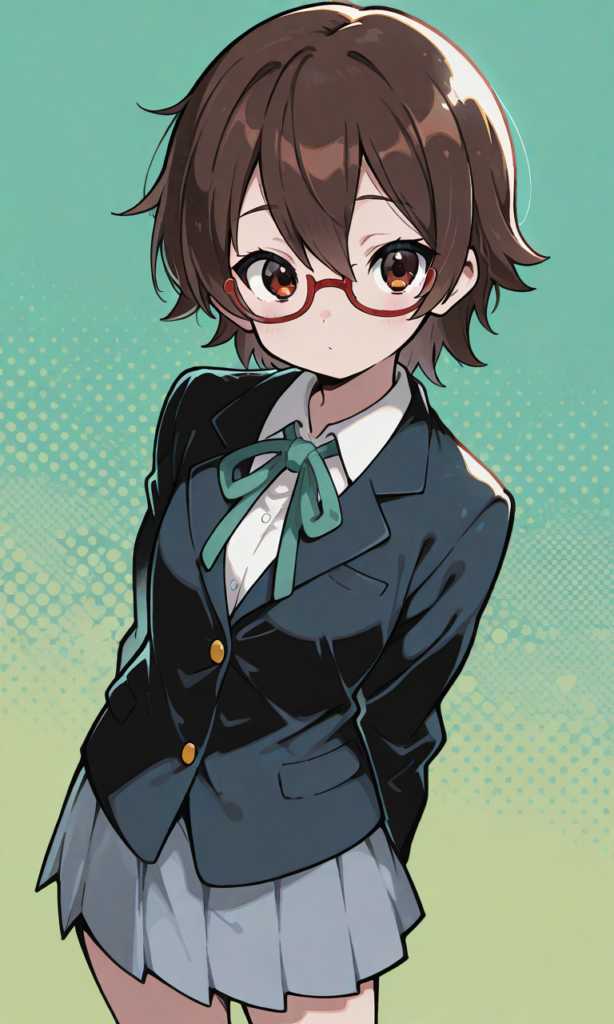 (flat design, anime coloring, vivid:1.5), solo,manabe nodoka(k-on!),glasses,short hair, school uniform,three-button blazer,green neckribonn,cowboy shot,looking at viewer,masterpiece,high quality,high resolution,light green background,neon pop art style,hyper-detailed, high contrast, depth of field, ray tracing, best lighting, cinematic composition, beautiful face, beautiful eyes, sharp focus, (masterpiece:1.2), (best quality:1.2), (very aesthetic:1.2), (absurdres:1.2), (detailed background),manga-texture, tone-art-style, dot-manga-style, screentone texture, halftone shading, printed texture