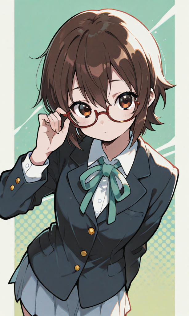 (flat design, anime coloring, vivid:1.5), solo,manabe nodoka(k-on!),glasses,short hair, school uniform,((three-button)) blazer,green neckribonn,adjusting eyewear, cowboy shot,looking at viewer,masterpiece,high quality,high resolution,light green background,neon pop art style,hyper-detailed, high contrast, depth of field, ray tracing, best lighting, cinematic composition, beautiful face, beautiful eyes, sharp focus, (masterpiece:1.2), (best quality:1.2), (very aesthetic:1.2), (absurdres:1.2), (detailed background),manga-texture, tone-art-style, dot-manga-style, screentone texture, halftone shading, printed texture