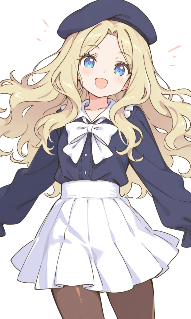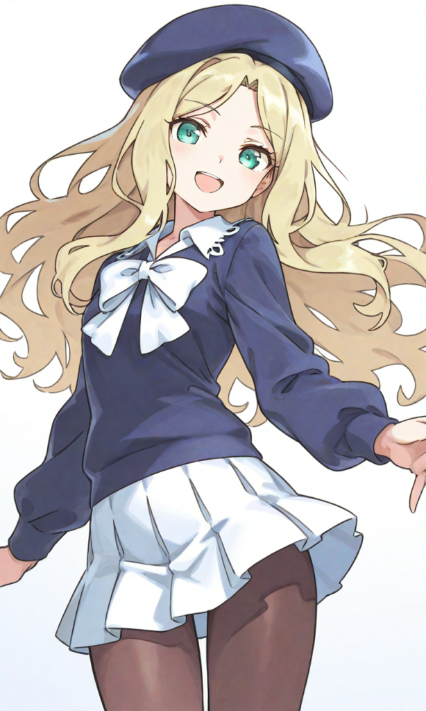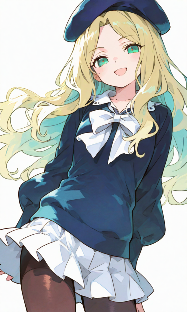Frenda Seivelun,haimura kiyotaka(style),green eyes, beret,white miniskirt,pantyhose,smile,open mouth, cowboy shot,simplebackground,white background, masterpiece,high quality, high resolution,high-res,[Watercolor], soft lines, harmonious color palette ,748cmstyle,hyper-detailed, high contrast, depth of field, ray tracing, best lighting, cinematic composition, beautiful face, beautiful eyes, sharp focus, (masterpiece:1.2), (best quality:1.2), (very aesthetic:1.2), (absurdres:1.2), (detailed background),
