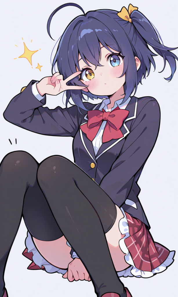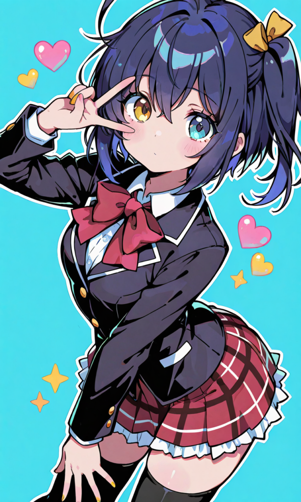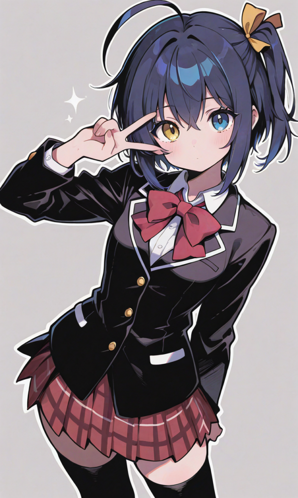 PixAI【Shiitake-Mix】takanashi rikka,tareme, heterochromia, gold eyes,blue eyes, school uniform, long sleeves, black thighhighs,v over eye, simple background, masterpiece,high resolution,high quality, ,high-res,♡masterpiece, highest quality, ♡,neon pop art style