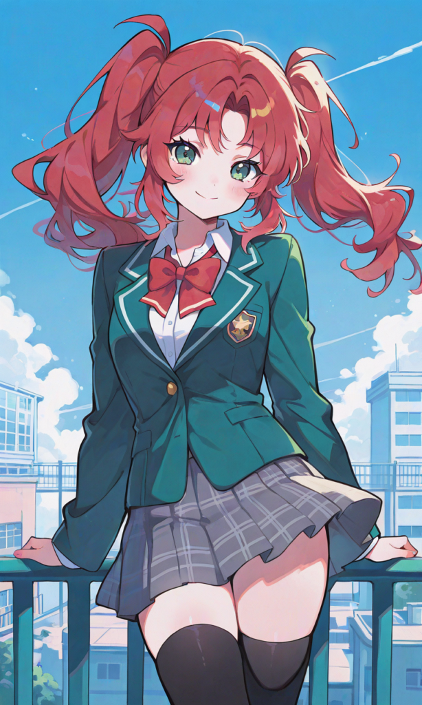 PixAI【Shiitake-Mix】Meyrin Hawke,twintail,smile,green eyes, no hair ornament, school uniform, green blazer,neck bowtie,red bowtie,gray plaid skirt,black thighhighs,cowboy shot,rooftop,fence,blue sky, masterpiece,high resolution,high quality, ,high-res,♡masterpiece, highest quality, ♡,neon pop art style,