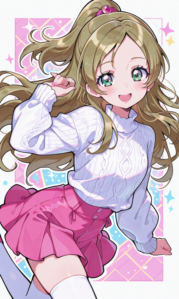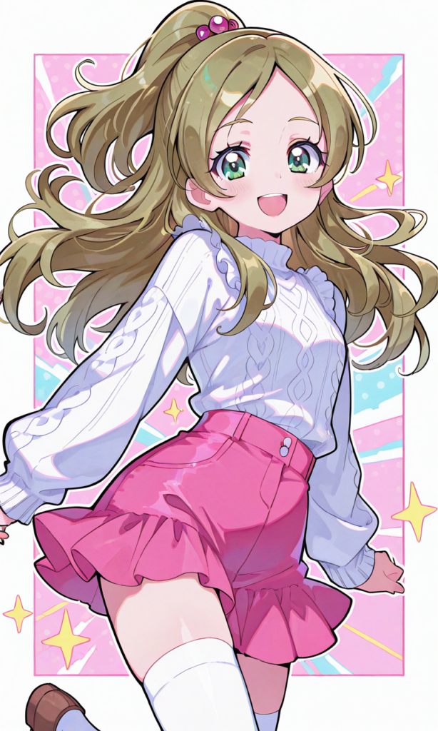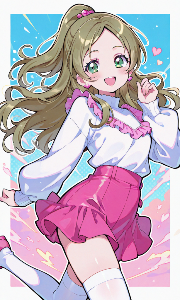 PixAI【Shiitake-Mix】minamino kanade(precure),pink frilled shirt,miniskirt,white knit sweater,white thighhighs,smile,open mouth, cowboy shot,skipping,looking at viewer, masterpiece,high resolution,high quality, ,neon pop art style,♡masterpiece, highest quality, ♡
