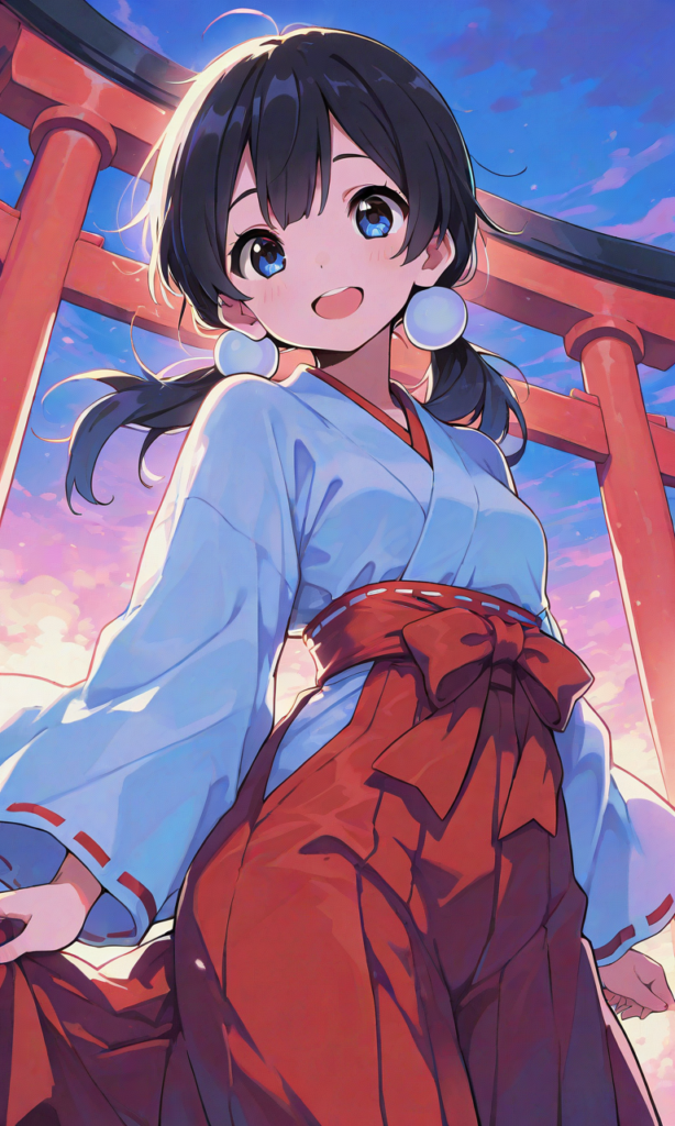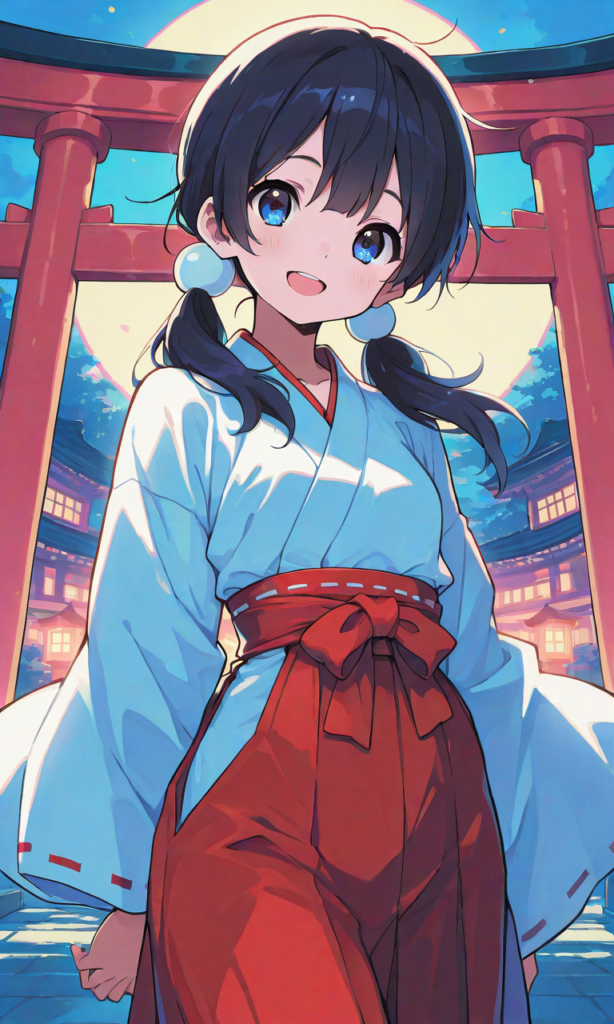 PixAI【Shiitake-Mix】kyou ani(style),kitashirakawa tamako,low twintails, miko, smile,open mouth, cowboy shot,torii,simplebackground, masterpiece,high quality, high resolution,high-res,neon pop art style,hyper-detailed, high contrast, depth of field, ray tracing, best lighting, cinematic composition, beautiful face, beautiful eyes, sharp focus, (masterpiece:1.2), (best quality:1.2), (very aesthetic:1.2), (absurdres:1.2), (detailed background),