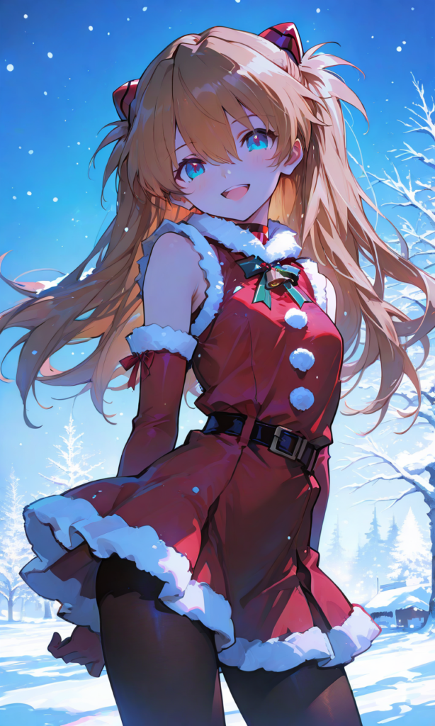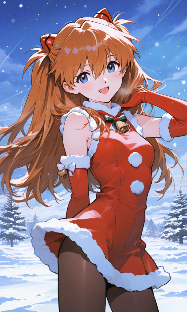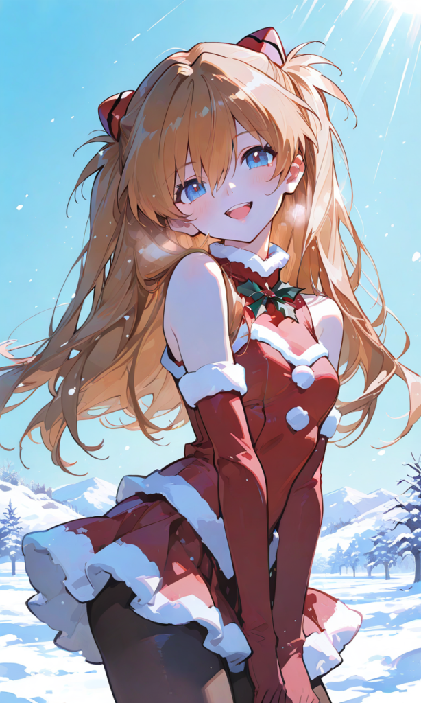 PixAI【Shiitake-Mix】Soryu Asuka Langley,sadamoto yoshiyuki (style),little girl,solo, santa costume,sleeveless,elbow gloves, miniskirt,pantyhose,smile,open mouth, looking at viewer, cowboy shot,simple background,glowing background, masterpiece,high resolution,high quality, christmas,snow, high-res,tokiame,hyper-detailed, high contrast, depth of field, ray tracing, best lighting, cinematic composition, beautiful face, beautiful eyes, sharp focus, (masterpiece:1.2), (best quality:1.2), (very aesthetic:1.2), (absurdres:1.2), (detailed background),