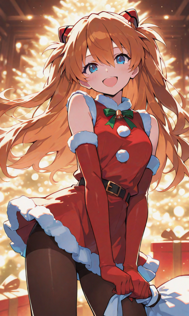 Soryu Asuka Langley,santa costume,sleeveless,elbow gloves, miniskirt,pantyhose,smile,open mouth, happy,looking at viewer, cowboy shot,masterpiece,high resolution,high quality, christmas, ,high-res,hyper-detailed, high contrast, depth of field, ray tracing, best lighting, cinematic composition, beautiful face, beautiful eyes, sharp focus, (masterpiece:1.2), (best quality:1.2), (very aesthetic:1.2), (absurdres:1.2), (detailed background),neon pop art style
