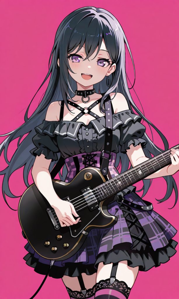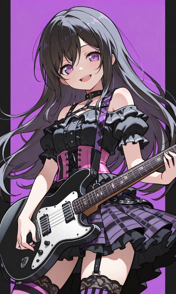 PixAI【Shiitake-Mix】hanazono tae(BanG Dream!),very long hair, punk costume,, choke,(light purple and black punk style blouse), (off shoulder, short puff sleeves), bare arms, (purple and pink horizontal striped corset with black lace-up), black leather harness straps, layered flared skirt with jagged hem, (purple and black tartan check pattern), wide A-line silhouette,mismatched (striped thigh-high stockings, one purple-pink and one black-white), striped pattern on stockings,,dark blue electric guitar,smile,open mouth, cowboy shot,simplebackground,masterpiece,high quality,high resolution ,tokiame