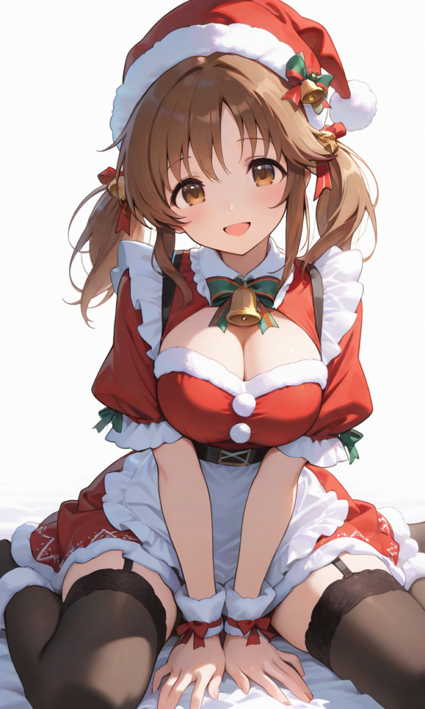 totoki airi, smile,open mouth,looking at viewer,wariza, cute girl, santa-themed maid outfit, red and white frilly maid dress with santa hat headband, black garter stockings, fluffy white trim, bells and ribbons, christmas ornaments accessories, smiling, warm indoor lighting, highly detailed, masterpiece, best quality cowboy shot,simplebackground,((white background)), masterpiece,high quality, high resolution,high-res,hyper-detailed, high contrast, depth of field, ray tracing, best lighting, cinematic composition, beautiful face, beautiful eyes, sharp focus, (masterpiece:1.2), (best quality:1.2), (very aesthetic:1.2), (absurdres:1.2), (detailed background),