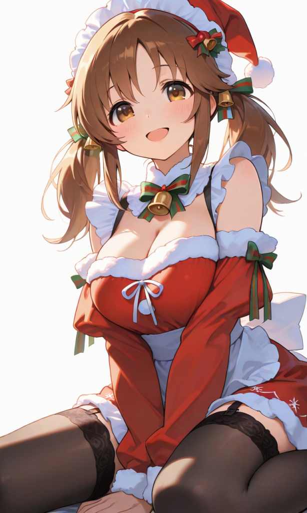 PixAI【Shiitake-Mix】totoki airi, smile,open mouth,looking at viewer,wariza, cute girl, santa-themed maid outfit, red and white frilly maid dress with santa hat headband, black garter stockings, fluffy white trim, bells and ribbons, christmas ornaments accessories, smiling, warm indoor lighting, highly detailed, masterpiece, best quality cowboy shot,simplebackground, masterpiece,high quality, high resolution,high-res,neon pop art style,♡masterpiece, highest quality, ♡