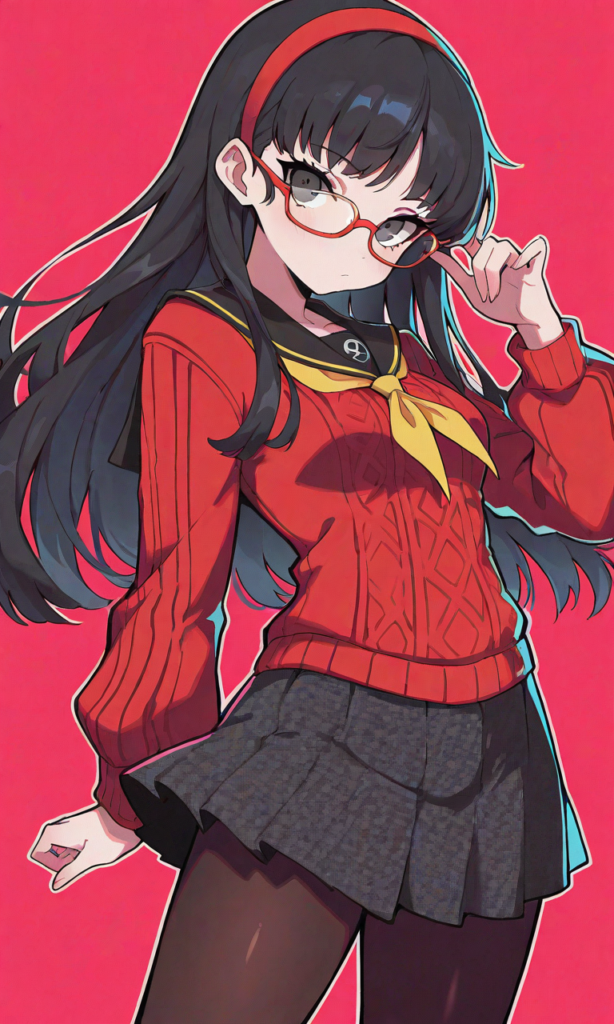 amagi yukiko(PERSONA4), school uniform,red sweater, pantyhose,glasses, looking at viewer, cowboy shot,simplebackground, masterpiece,high quality, high resolution,high-res,neon pop art style