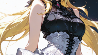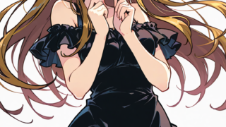 PixAI【Shiitake-Mix】tokoro megumi, black frilled dress, off-shoulder dress, sleeveless, looking at viewer, black thighhi...