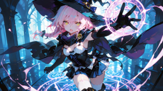PixAI【Shiitake-Mix】1girl, light pink hair, single braid, yellow eyes, witch, black elbow gloves, scarf, cloak, bustier,...