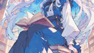 PixAI【Shiitake-Mix】1girl, sitting on stacks of books, reading book, looking at viewer, smile, open mouth, full body...