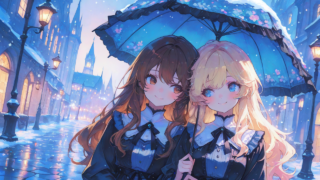 PixAI【Shiitake-Mix】2girls, sharing umbrella, blonde hair, brown hair, upper body, smile, looking to the side, dutch ang...