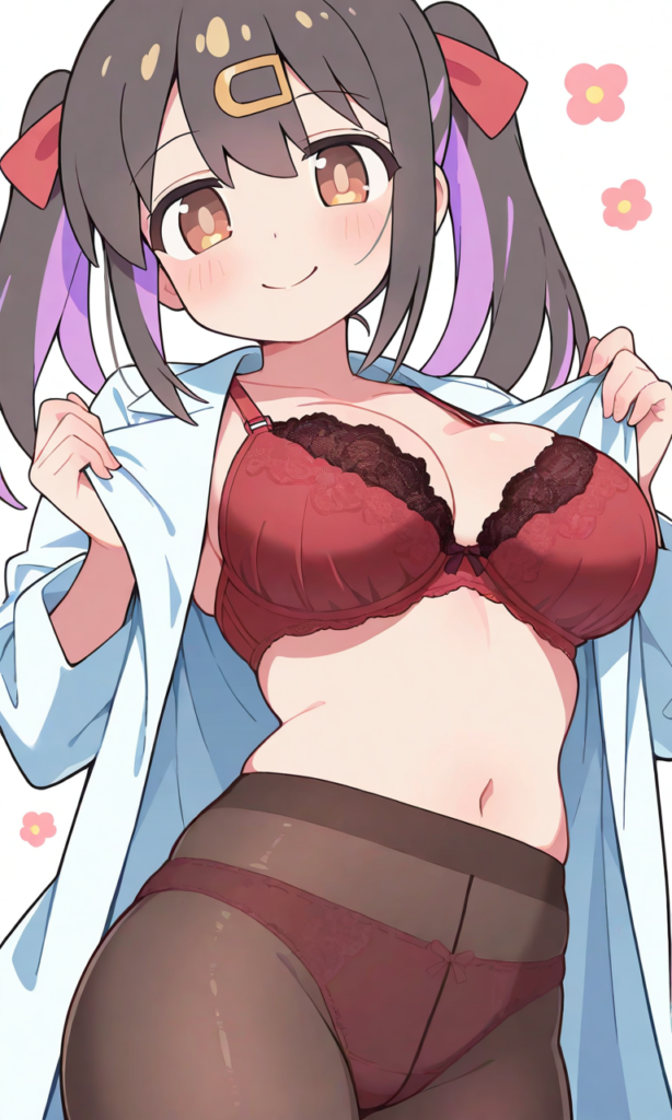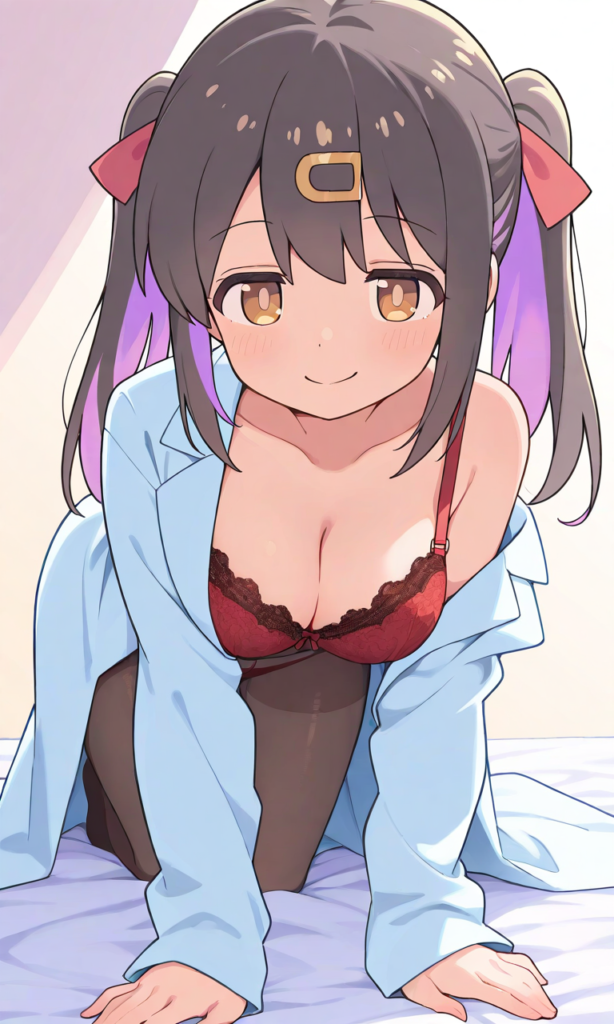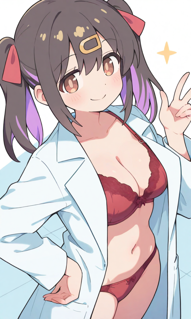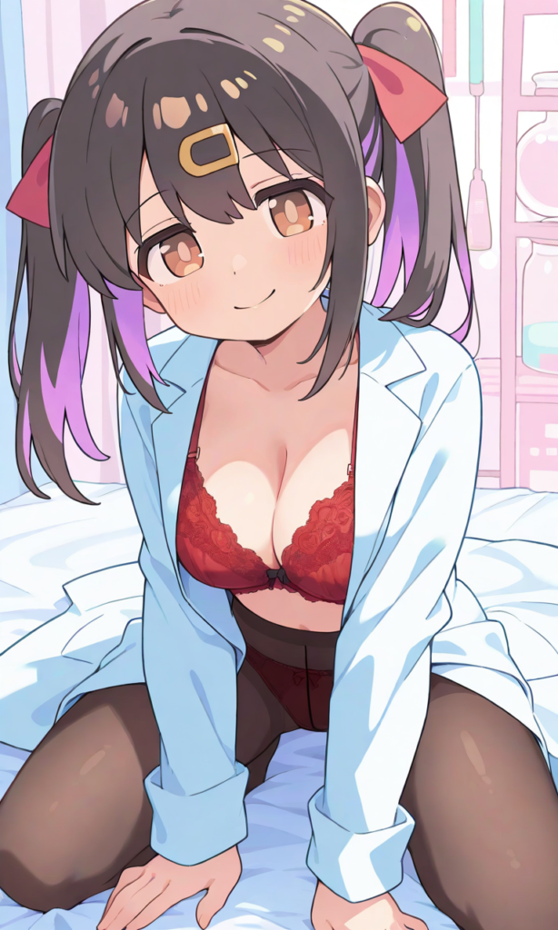 PixAI【Shiitake-Mix】onimai,oyama mihari,red bra,lace bra,panties,panties under pantyhose,lab coat,coat over bra,smile,looking at viewer,kneeling , cowboy shot,masterpiece,high resolution,high quality, ,high-res