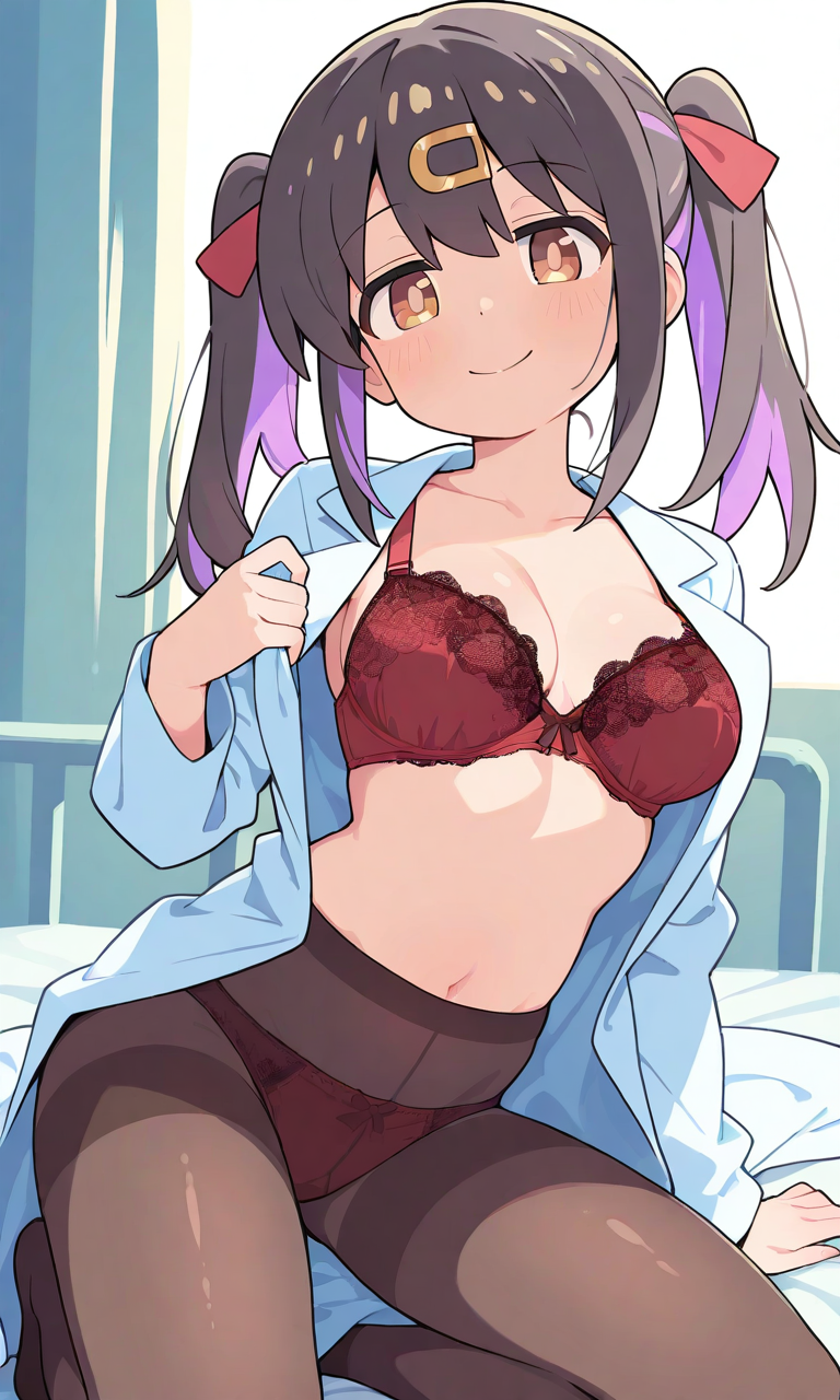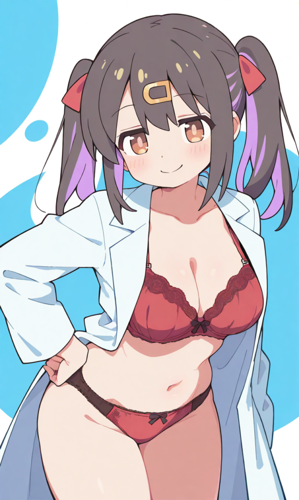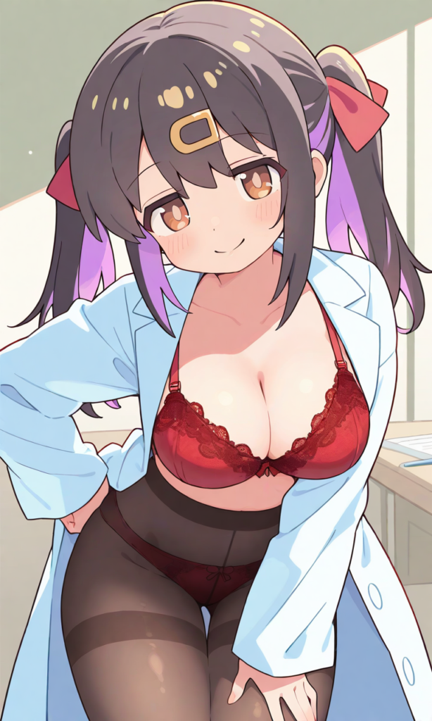 onimai,oyama mihari,red bra,lace bra,panties,panties under pantyhose,lab coat,coat over bra,smile,looking at viewer, cowboy shot,masterpiece,high resolution,high quality, ,high-res