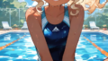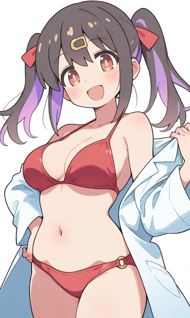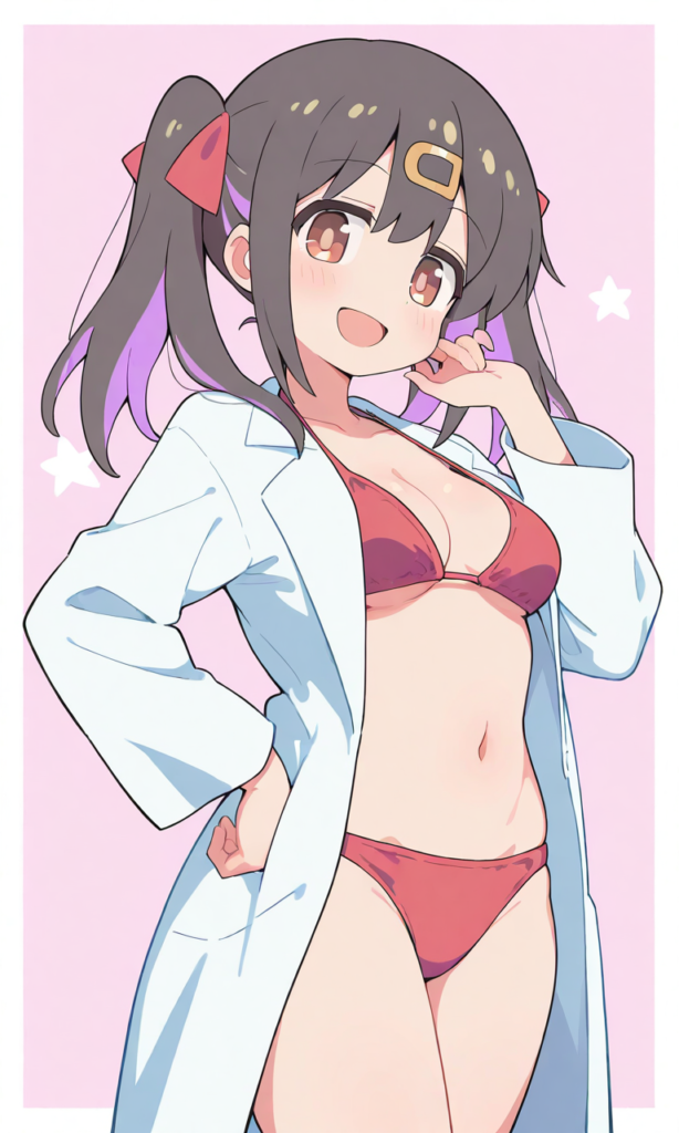 onimai,oyama mihari,red bikini,lab coat,coat over bikini,smile,,open mouth,hand on own hip, cowboy shot,masterpiece,high resolution,high quality, ,high-res