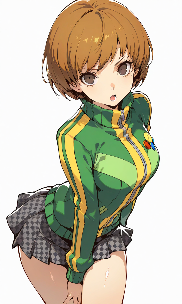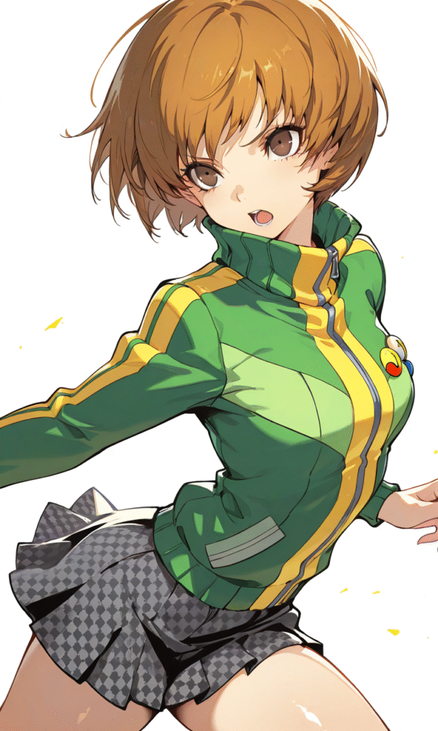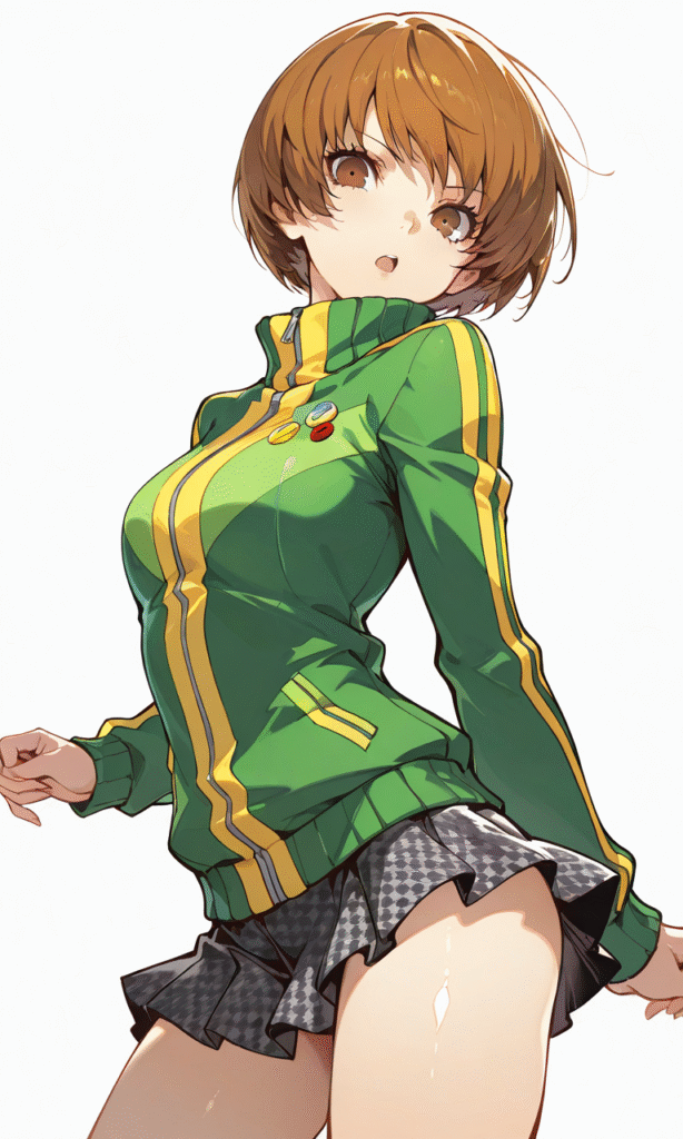 PixAI【Shiitake-Mix】satonaka chie(PERSONA4),serious,open mouth,track suit,miniskirt,looking at viewer, cowboy shot,simplebackground,white background, masterpiece,high quality, ,shiny skin, shiny,tokiame