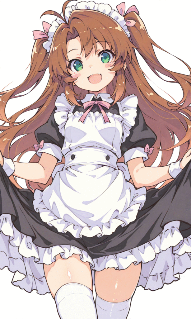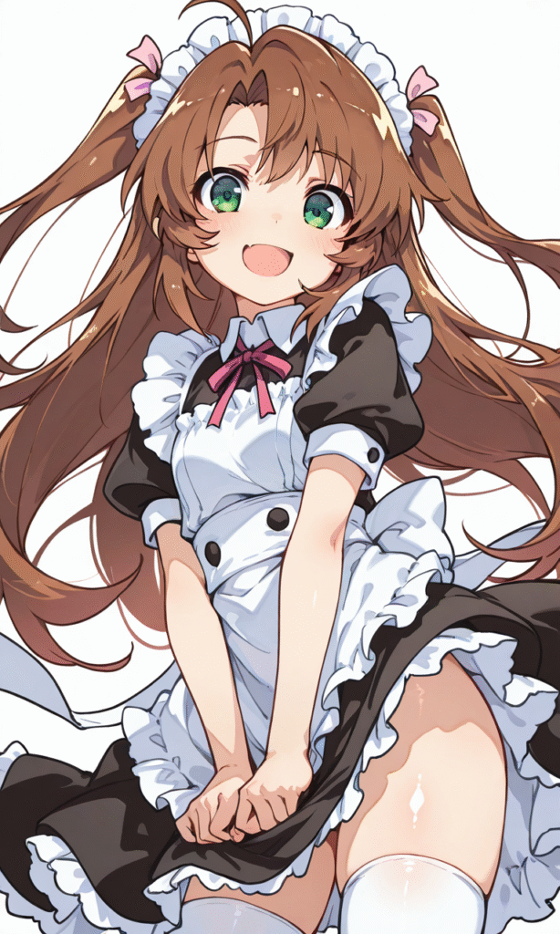 PixAI【Shiitake-Mix】koshigaya komari, maid,short sleeves, white thighhighs, smile,open mouth, cowboy shot,simplebackground,white background, masterpiece,high quality, ,shiny skin, shiny,tokiame,pastel colors, stickers, stylized